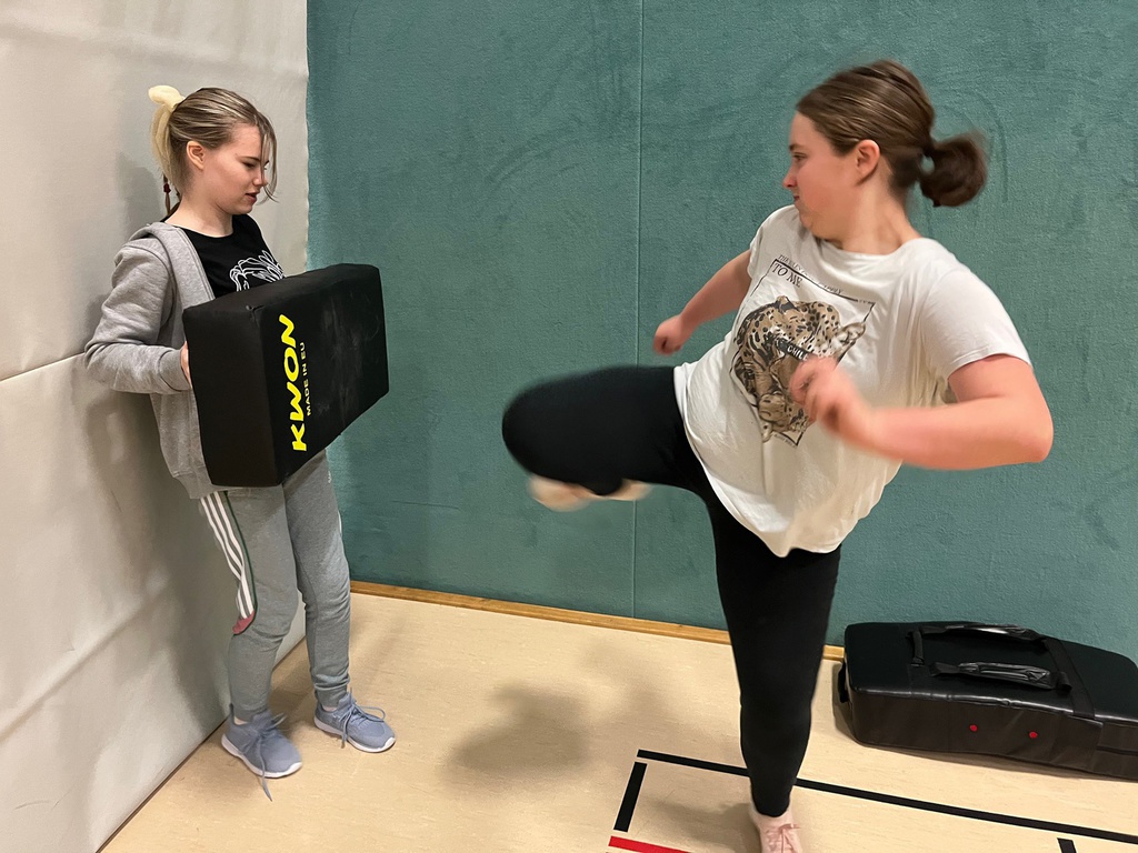 Die Schülerinnen lernten unterschiedliche Techniken zur Selbstverteidigung kennen, um sich in Gefahrensituationen zu wehren, sich zum Beispiel aus Griffen zu befreien oder Würge- oder Schlagangriffe abzuwehren.