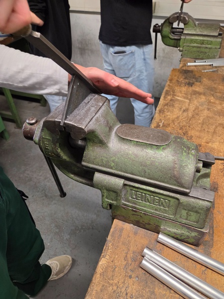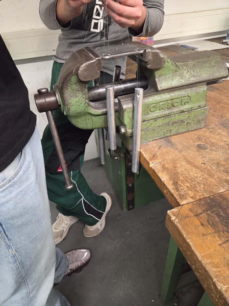 Im Werkraum: Anfertigen von Namensschildern aus Aluminium mittels Metallbearbeitung (Herr Pabst)